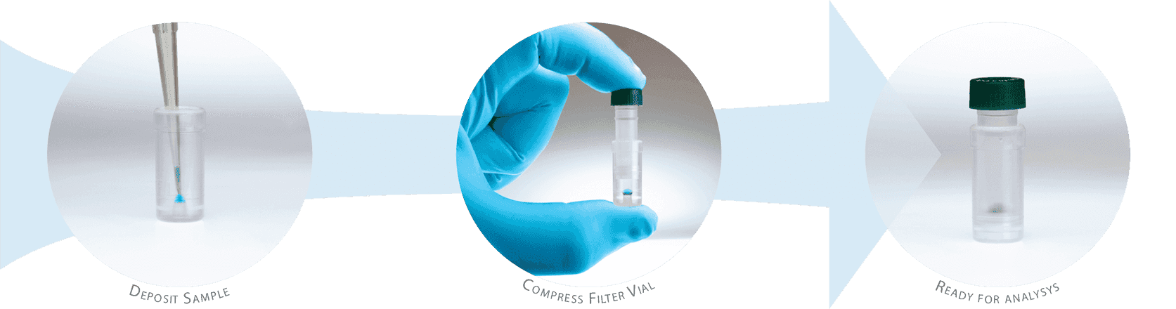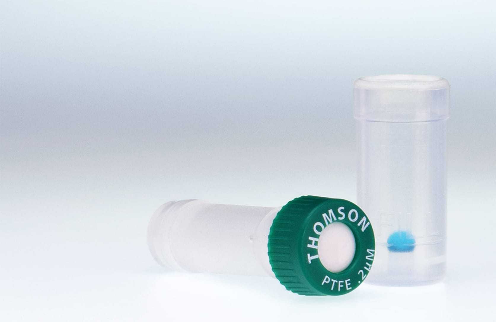 Thomson nano|Filter Vial® offer a very low dead volume, allowing one to filter as little as 10μL of sample with enough remaining filtrate to make a 2μL injection.
